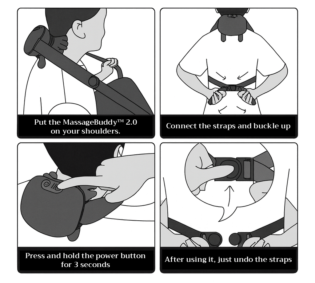 Simply follow the steps shown in the images. MassageBuddy™ 2.0 is designed to be easy, intuitive, and ready to use straight out of the box. Full instructions are also included with your order.
