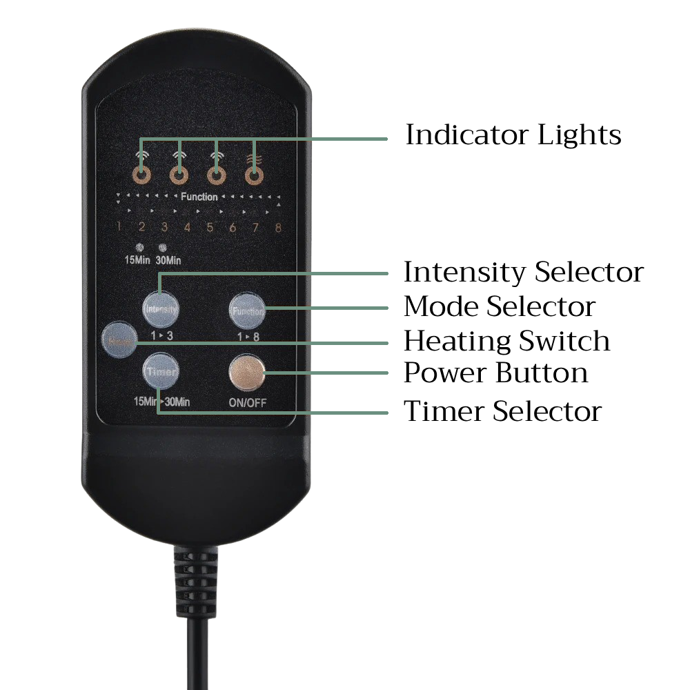 Adjust Everything Instantly With The Smart Remote Control: Easily switch between 8 massage modes, three intensity levels, and a 15–30 min timer directly from the handheld controller.